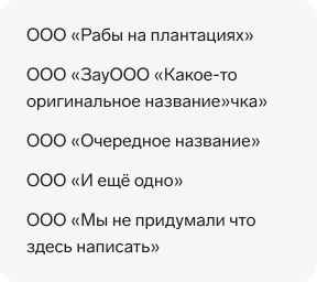 Если длина реквизита бывает разной, используйте примеры разной длины, а не такой, которая хорошо входит в поля или ячейки таблиц.